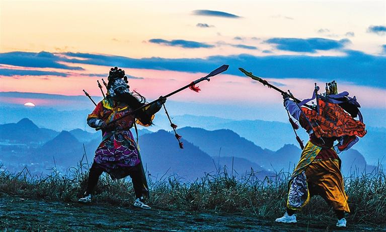 ▼2月7日,贵州省龙里县“草根戏班”的年轻人在排练太平花灯戏,一招一式见真功。 杨文斌摄