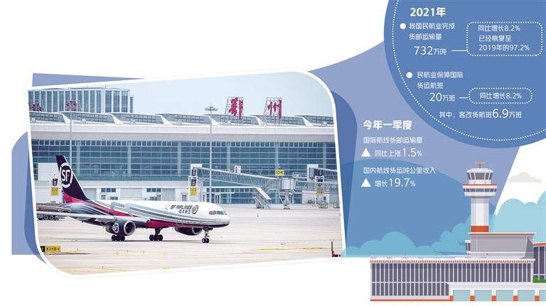 2021年12月,中国民航局、国家发展改革委和交通运输部联合印发《“十四五”民用航空发展规划》,明确提出要打造高效的航空物流网。据统计,2021年我国民航业完成货邮运输量732万吨,同比增长8.2%,已经恢复至2019年的97.2%。2021年,我国航空货运的恢复情况远好于航空客运,全行业保障国际货运航班20万班,同比增长8.2%,其中,客改货航班6.9万班。今年一季度,虽然国内航线货邮运输量同比下降15.9%,但国际航线货邮运输量同比小幅上涨了1.5%。国内航线、国际航线货运吨公里收入水平分别增长了19.7%和66.4%。受货运收益水平增长带动,一季度航空货运收入同比增长超过一半。