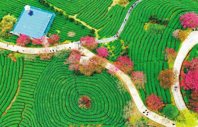 2月5日,福建省漳平市永福镇樱花茶旅景区,红色的樱花与绿色的茶园相互映衬。朱海鹏摄