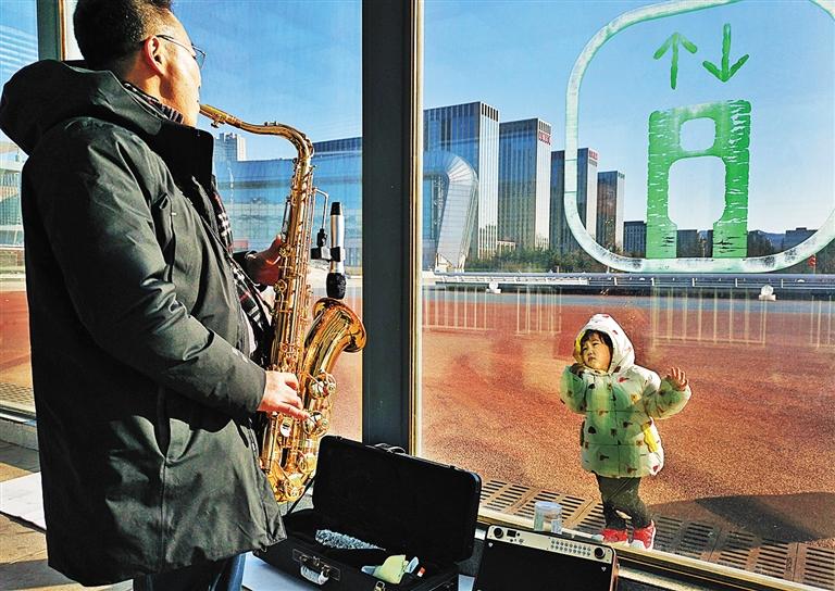 2月1日,山东省济南市奥体中心,萨克斯爱好者姜志强在广场电梯房吹奏乐曲,吸引了窗外两岁半的小朵朵听得入神。钱 捍摄