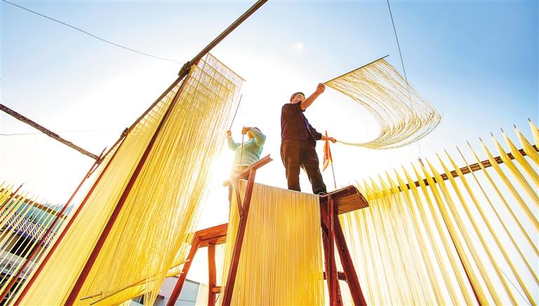 2月13日,四川省中江县觉慧村村民在屋顶晾晒手工挂面。艾加宪摄