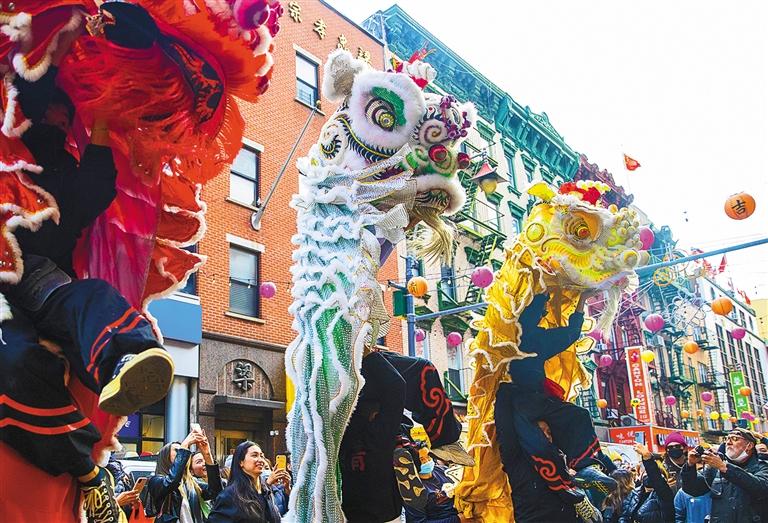2月12日,美国纽约曼哈顿唐人街,民众观看舞狮感受中国农历新年。廖 攀摄