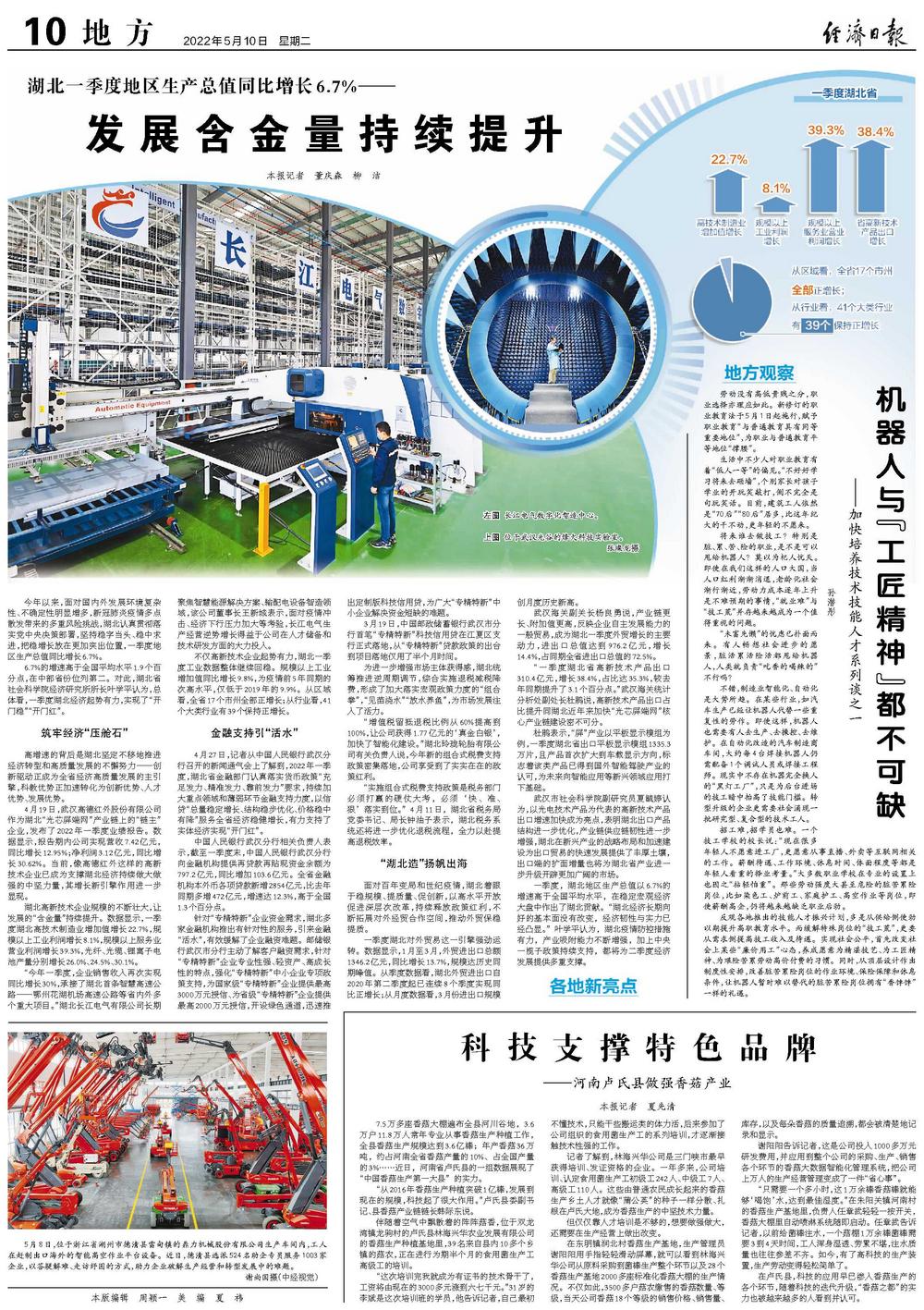 “今年一季度,企业销售收入再次实现同比增长30%,承接了湖北首条智慧高速公路——鄂州花湖机场高速公路等省内外多个重大项目。”湖北长江电气有限公司长期聚焦智慧能源解决方案、输配电设备智造领域,该公司董事长王新城表示,面对疫情冲击、经济下行压力加大等考验,长江电气生产经营逆势增长得益于公司在人才储备和技术研发方面的大力投入。