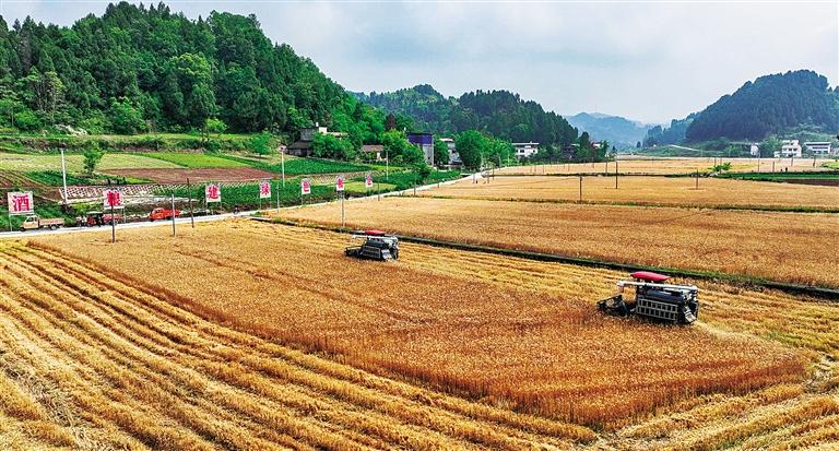 5月12日,四川省射洪市涪西镇四方村酒粮基地,粮农趁晴好天气抢收小麦。近年来,射洪市建立了以酒粮为代表的现代农业产业体系,覆盖当地沱牌、涪西、瞿河、太乙等4个镇20余个村,主要种植小麦、水稻、高粱、玉米、大麦等作物。