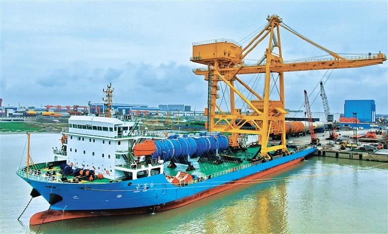 5月11日,江苏省启东市海工船舶工业园华滋能源码头,装载着桥式抓斗卸船机的船舶准备驶往印度尼西亚。本次交付出口的卸船机采用欧洲标准设计、制造和检验,并在国内完成整机安装调试,将服务于印度尼西亚最大的国有化工项目。