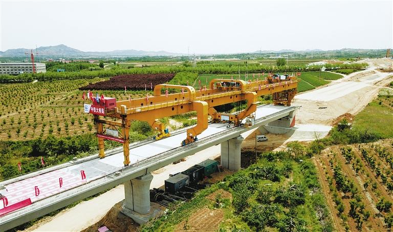 5月14日,中铁大桥局工人在潍烟高铁招远段进行架梁作业(无人机照片)。潍(坊)烟(台)高铁施工方在严格防控疫情基础上,积极复工复产。潍烟高铁招远段14日实现贯通,为后续铺轨施工奠定了基础。潍烟高铁是“八纵八横”高铁主通道中沿海通道的重要组成部分,建成后将加快山东半岛城市群互联互通进程。新华社记者 郭绪雷摄