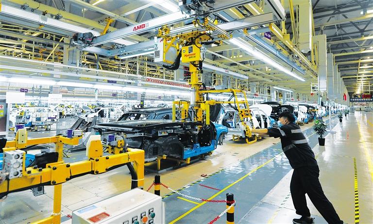 在安徽省合肥市蜀山区南岗镇一家汽车企业生产车间里,工人们正在流水线上作业。