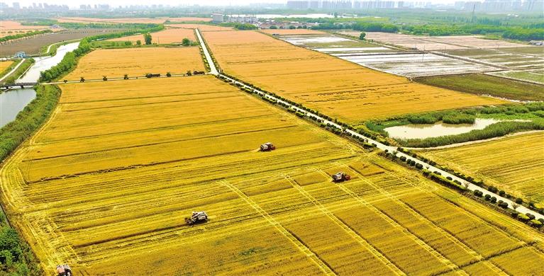 5月17日,联合收割机在江苏昆山淀山湖镇红亮村麦田收割小麦。农业农村部近日要求,各地要打通堵点卡点,全力保障小麦机收顺利开展,对联合收割机及运输服务车辆实行优先查验、优先放行。袁新宇摄(中经视觉)