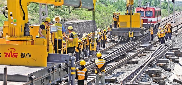 5月17日,中国铁路郑州局集团南阳工务段组织铁路职工对宁西线疏解区道岔中的“可动心”辙叉进行更新施工。暑运即将到来,南阳工务段正在进行道岔更新施工,及时消除安全隐患,确保铁路运力。张中海摄(中经视觉)