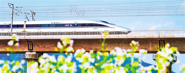 和谐号列车行驶在赣深高铁赣州龙南段。赣深高铁开通运营后,赣州至深圳的最快铁路旅行时间由原来的5小时32分压缩至1小时49分,两地迎来“半小时生活圈”和“两小时经济圈”。 史港泽摄