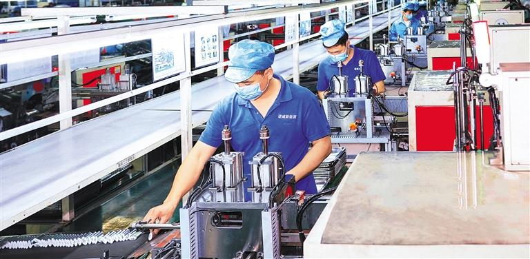 在江西龙南经济技术开发区的赣州诺威新能源科技有限公司,员工在锂离子电池生产车间赶制订单。赣州市深入推进“粤企入赣”工程,共建汽车零部件、电子信息智能设备等生产基地,实现优势互补、产业联动、利益共享。李林烜摄