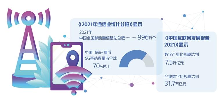 与此同时,中国的数字经济却在近几年迅猛发展。一方面,中国数字巨头企业频频在国际舞台亮相,如华为、阿里巴巴、腾讯等;另一方面,中国的数字化建设进程也在不断提速。《2021年通信业统计公报》显示,2021年,中国移动通信基站总数达996万个,其中4G基站590万个,5G基站142.5万个,全年新建5G基站超65万个。工业和信息化部信息通信发展司司长谢存介绍,中国目前已建成5G基站数量占全球70%以上。据《中国互联网发展报告2021》显示,中国数字产业化规模达到7.5万亿元,产业数字化规模达到31.7万亿元。新产业、新业态、新模式不断涌现,工业、农业、服务业数字化水平不断提升,中国正朝着全球高端产业链迈进,这也为中欧数字经济领域合作打开了新局面。