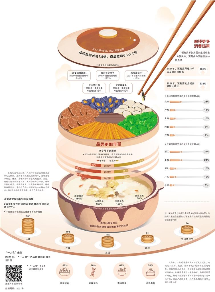 另一方面,很多消费者选择预制菜就是为了方便和健康。数据显示,2021年代餐轻食品类成交额同比增长82%,同时女性群体的儿童速食成交额同比增长78%。建议新入局企业可以更加聚焦这类需求,不仅在产品设计上突出健康和便捷,也要通过短视频等新型消费渠道精准对接这些消费者。
