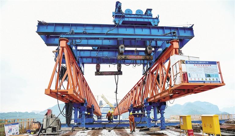 5月19日,建设者在贵州省黔西南布依族苗族自治州兴义市金州大桥施工现场作业。金州大桥全长1600米,设计时速60公里,建成后将有助于改善当地交通基础设施,解决群众出行问题,带动城际间经济社会发展。