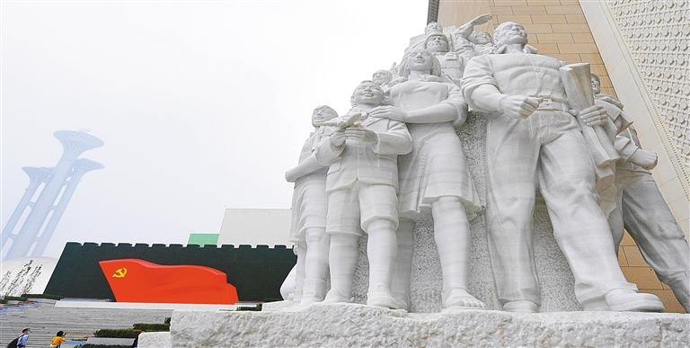 ▼中国共产党历史展览馆广场上的《伟业》雕塑表现了百年来在党的领导下中国发生的巨变,展现全国人民为民族复兴而奋斗的坚定信念。本报记者 高兴贵摄