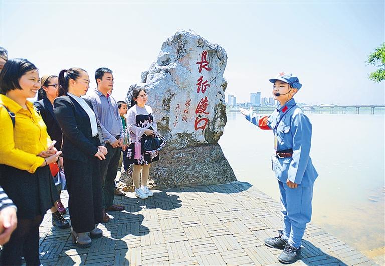 ◀在江西省于都县中央红军长征集结出发地长征渡口前,小红星讲解员为游客讲述红色故事。近年来,于都县着力做好“红色资源+”文章,营造全社会传承红色基因的浓厚氛围。