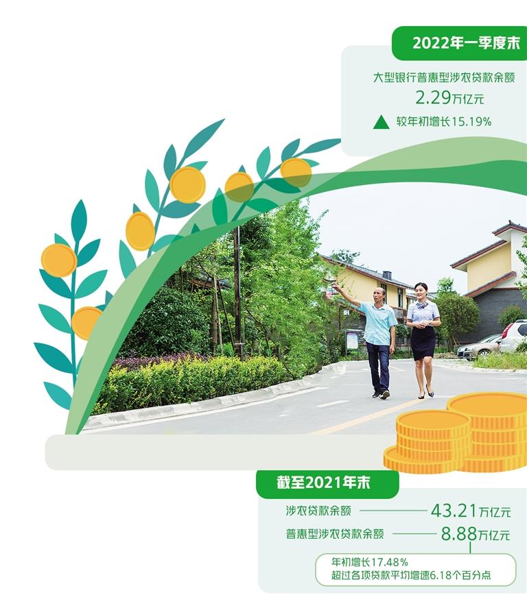 数据显示,截至2022年一季度末,大型银行普惠型涉农贷款余额2.29万亿元,较年初增长15.19%。