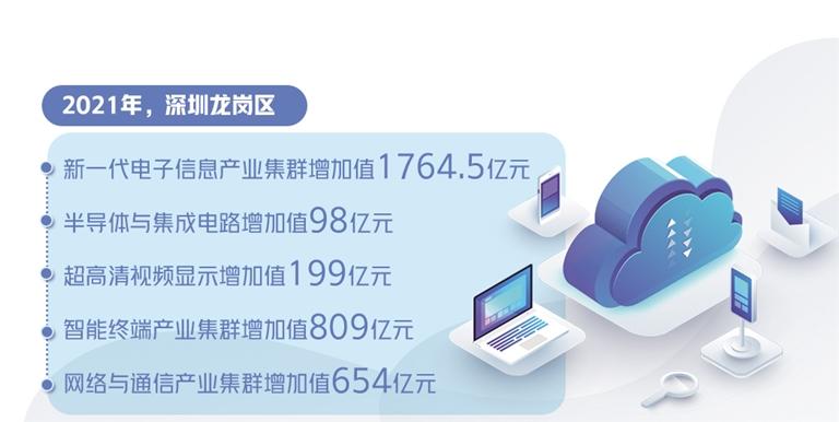 数据显示,2021年,龙岗区新一代电子信息产业集群增加值1764.5亿元,半导体与集成电路增加值98亿元,超高清视频显示增加值199亿元,智能终端产业集群增加值809亿元,网络与通信产业集群增加值654亿元。深圳市智能终端产业联盟副会长章炜表示:“依托新一代电子信息产业规模大、占比高的产业基础,龙岗区将成为推动特色产业集群化发展的一方沃土。”