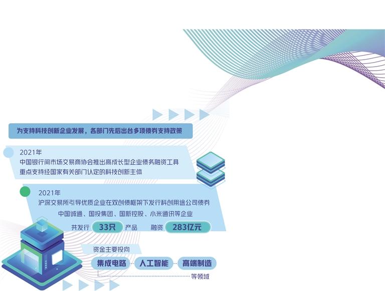 科创债是在双创债基础上创新而来。自2017年起,沪深交易所积极开展双创债试点,并于2021年引导优质企业在双创债框架下发行了科创用途公司债券。中国诚通、国投集团、国新控股、小米通讯、TCL科技、中关村发展、深创投等企业共发行33只产品、融资283亿元,资金主要投向集成电路、人工智能、高端制造等前沿领域。