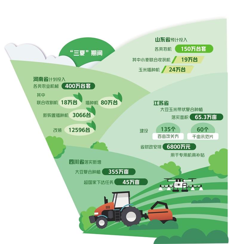 夏种粮食面积4.6亿亩,占全年的四分之一,今年大豆玉米带状复合种植的65%都是夏播。农时紧、农事重,黄淮海地区收完小麦就得腾茬种夏玉米夏大豆,南方双季稻区还要“双抢”,必须压茬推进,确保夏播粮食作物种足种满、种在适播期。眼下,各省正进一步分解压实夏播任务,落到具体地块和生产主体,确保应播尽播、面积只增不减。