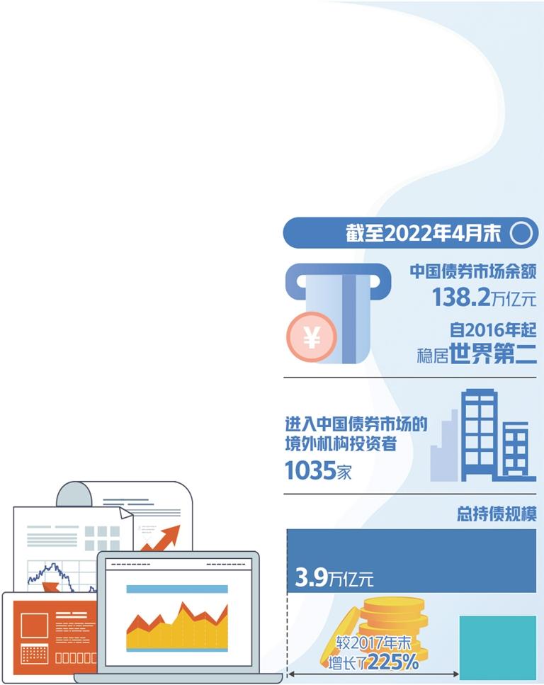数据显示,截至2022年4月末,中国债券市场余额为138.2万亿元,自2016年起稳居世界第二,共有1035家境外机构投资者进入中国债券市场,总持债规模为3.9万亿元,较2017年末增长了225%。同时,彭博、摩根大通和富时罗素三家国际债券指数供应机构均已将我国债券纳入其主要债券指数。