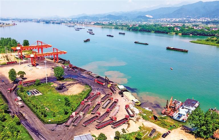 5月25日,浙江省金华市兰溪港女埠综合作业区,大型机械正在进行卸煤作业,等待的货船、卡车排起长队。近来,金华市全力加码水运物流,助推企业复工复产。截至5月25日,该综合作业区吞吐量达70万吨,同比增长23%。