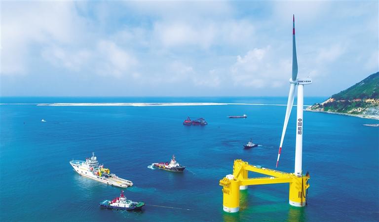 5月29日,国内首台深远海浮式风电装备“扶摇号”从广东茂名广港码头拖航前往湛江罗斗沙海域进行示范应用。由中国船舶集团海装风电股份有限公司牵头,联合相关单位自主研制的“扶摇号”浮式风电机组浮体平台上配备6.2兆瓦抗台型I类风力发电机组,在深远海应用场将依靠九个对称分布的悬锚链系泊实现固定。新华社记者 刘大伟摄