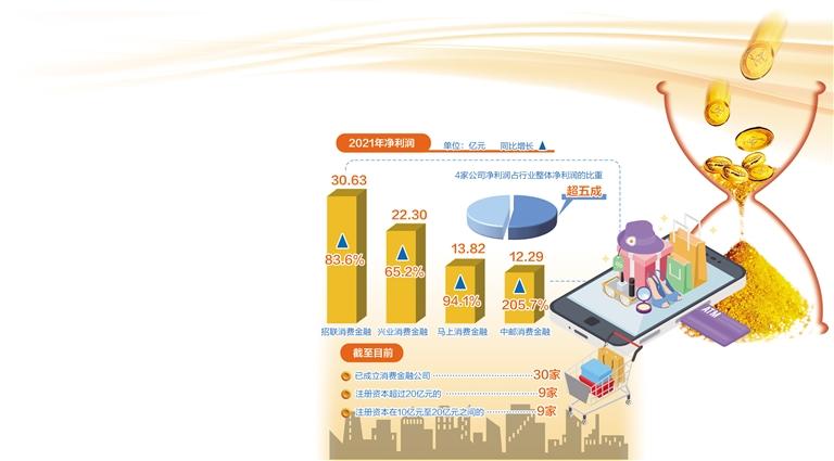 以头部消费金融公司的净利润和资产规模为例,排名前4位的消金公司合计体量占一半。2021年财报显示,招联、兴业、马上和中邮消费金融公司净利润分别是30.63亿元、22.30亿元、13.82亿元和12.29亿元,同比增长分别是83.6%、65.2%、94.1%和205.7%,这4家消费金融净利润占所有盈利消金公司净利润的比重超五成。