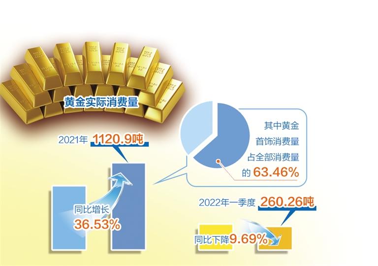 近来,黄金消费和投资出现降温迹象。中国黄金协会最新统计数据显示,2022年一季度,全国黄金实际消费量260.26吨,与2021年同期相比下降9.69%。其中:黄金首饰168.86吨,同比下降0.19%;金条及金币69.62吨,同比下降27.71%。