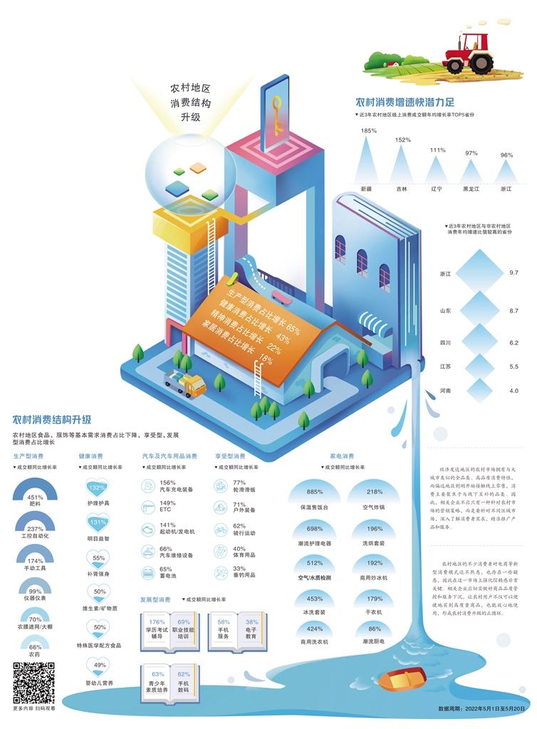 “提质扩容”是农村市场的主旋律。从线上消费的品类结构分析,食品、服饰等基本需求消费占比有所下降,享受型、发展型消费占比明显上升。轮滑、户外等运动用品,维生素等健康用品的消费同比增速都超过100%。而图书消费中的学历考试、技能培训类书籍热销,说明农村消费者更具成长性。