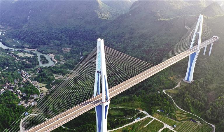 近日,位于贵州省余庆至安龙高速公路平塘至罗甸段的平塘特大桥巍峨耸立于崇山峻岭之中,与河流、村庄等交相辉映。平塘特大桥横跨槽渡河峡谷,为贵州山区最大跨径的三塔斜拉桥,桥塔采用钻石形设计,主塔高达332米,创下了“最高混凝土桥塔”的世界纪录。