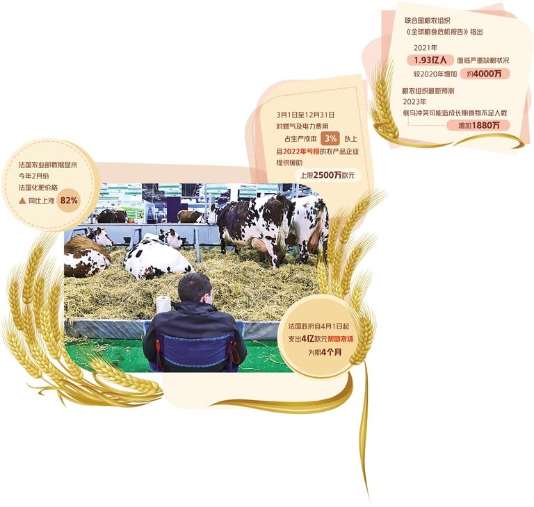 对此,法国政府在俄乌冲突后便宣布新计划,采取系列措施予以应对。一方面,针对性帮扶农场主及农产品生产者,以解决燃眉之急。如法国政府自4月1日起支出4亿欧元帮助高度依赖食品采购的农场支付额外的动物饲料成本,为期4个月;3月1日至12月31日期间,对燃气及电力费用占生产成本3%以上且2022年亏损的农产品企业提供援助,上限为2500万欧元。此外,法国政府成立专项工作组,确保今年的化肥生产及原料进口正常运转,并调整或推迟可能影响今年化肥供应的监管措施。