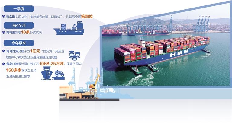 一条条保畅通、稳外贸举措频频“上新”,稳住了企业发展的势头和信心,稳住了经济增长的预期和决心。今年一季度,山东港口青岛港实现货物、集装箱吞吐量“双增长”,均跃居全国第四位;前4个月,新增10条外贸航线……繁忙的港口背后,是青岛全力保畅通、稳外贸的强劲脉动。