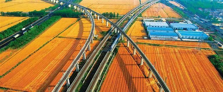 6月2日,江苏连云港市,动车组列车从东海县张湾乡四营村即将收割的麦田上方驶过。各地抢抓晴好天气,有序推进小麦机收。截至6月1日,全国投入小麦联合收割机17.4万台,已收获小麦面积6518万亩。