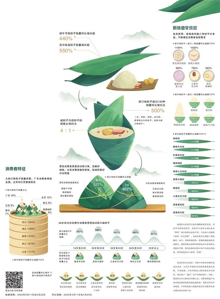 数据显示,今年端午节前推出的新口味粽子超过130种,销量环比增长近5倍。新食材带来新变化,甜咸之争已经不再是粽子话题的主战场,各种新潮、猎奇的口味越来越吸睛。例如,藤椒牛肉粽、香辣小龙虾粽等网红跨界美食销售火爆,销量环比增幅均超过10倍。以地方名菜作为馅料的佛跳墙粽,添加了名贵食材的鲍鱼粽、燕窝粽、黑松露粽,都让小小粽子身价倍增。还有奶茶粽、螺蛳粉粽、臭豆腐粽、植物肉粽……总之,只有想不到,万物皆可“粽”。
