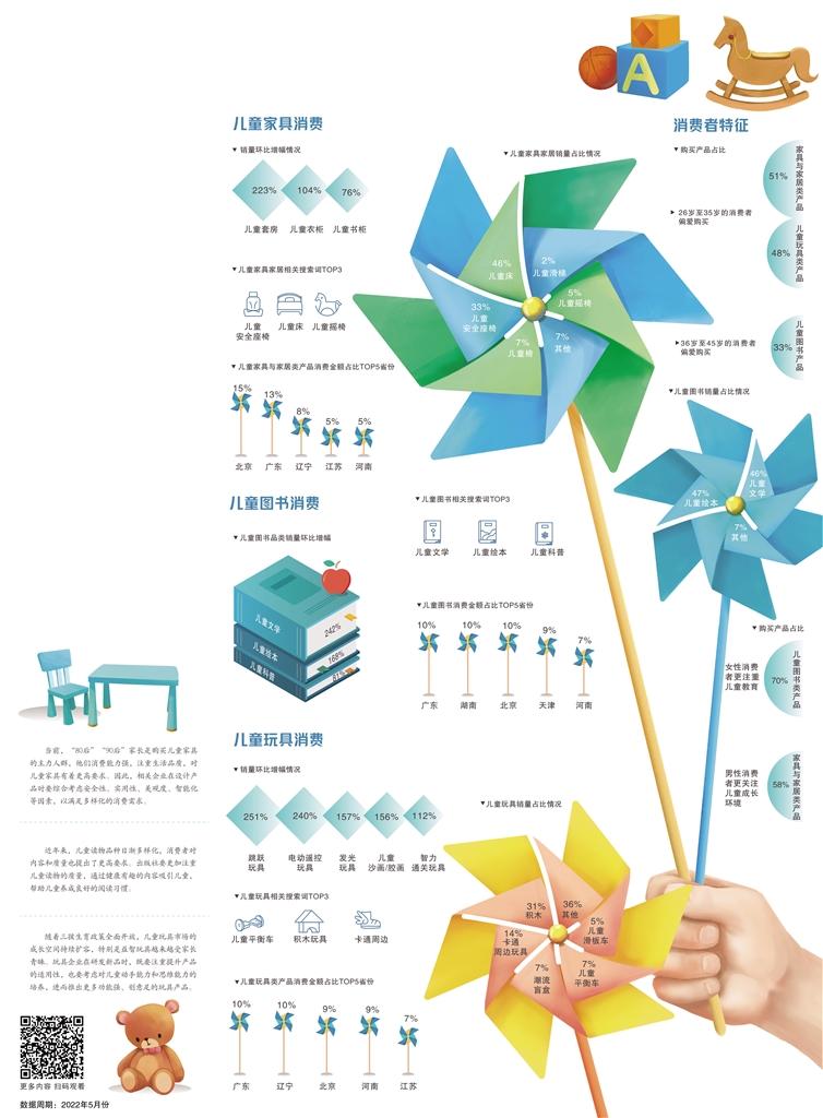儿童高质量成长是家长们的重要需求。特别是“双减”政策落地后,家长们愈加重视寓教于乐和多元化能力培养。数据显示,儿童绘本、儿童文学类书籍销量在节前实现了环比大幅增长;跳跃玩具、遥控玩具等销量名列前茅,平衡车、滑板车的关注度很高,代表着家长对孩子快乐成长、全面发展的期许。