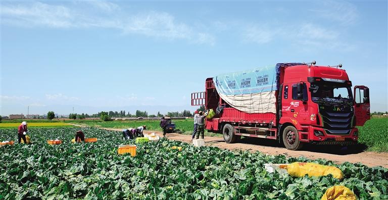 6月5日,甘肃省张掖市甘州区三闸镇庚名村蔬菜基地,菜农正将采收的甘蓝装车运往兰州市场。近年来,甘州区把蔬菜产业作为农业增效、农民增收和乡村振兴的支柱产业。目前,全区高原夏菜种植面积已达40余万亩。杨永伟摄(中经视觉)