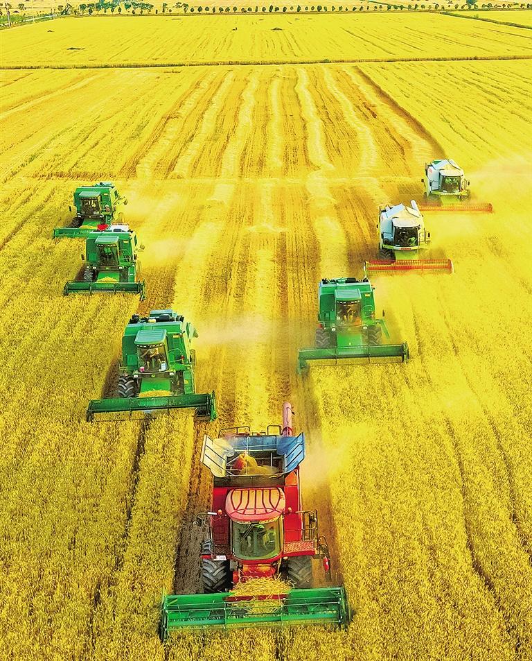在江苏省泗洪县重岗街道一万亩农场,10多台套收割机、搂草机、打捆机,边收割边搂草边打捆,高效快捷,确保颗粒归仓。陈 玉摄(中经视觉)