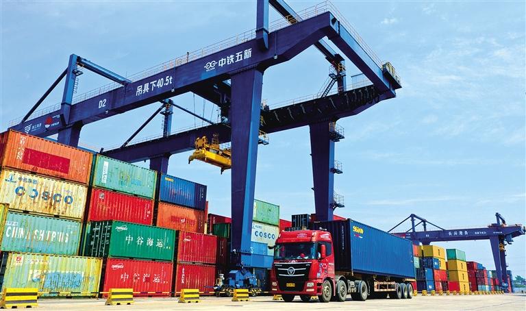 6月8日,浙江省湖州市长兴县综合物流园区内,工作人员正在操作龙门吊搬运集装箱。今年以来,当地进一步加大助企纾困力度,通过公路铁路水路多式联运保障物流链畅通稳定,服务企业高质量发展。许 旭摄(中经视觉)