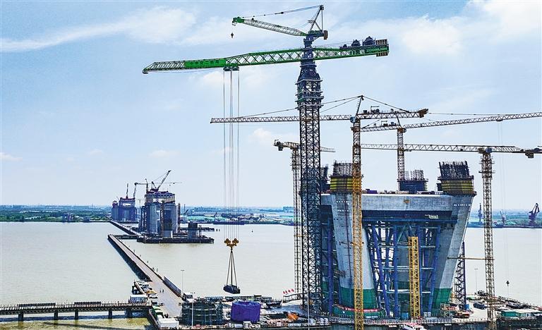 6月7日,江苏泰州市,全球首台超万吨米级上回转超大型塔机在中交二航局承建的常泰长江大桥投入使用。该塔机最大起重重量达450吨,最大起升高度400米,相当于可一次起吊300辆小轿车至130层楼的高度,彰显我国大型装备制造实力。
