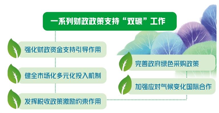近年来,财政部不断创新完善政策制度,综合运用财政资金引导、税收调节和政府绿色采购等多种政策措施支持推进碳达峰碳中和工作。例如,在强化资金保障方面,2021年中央财政加强资源统筹,优化支出结构,安排支持绿色低碳发展相关资金约3500亿元;同时,还推动建立多元化资金投入机制,规范有序推进生态环保领域政府和社会资本合作(PPP),更好发挥财政资金“四两拨千斤”的撬动作用。
