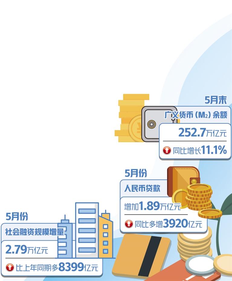 6月10日,中国人民银行发布的金融统计数据显示,5月末,广义货币(M_2)余额252.7万亿元,同比增长11.1%,增速分别比上月末和上年同期高0.6个和2.8个百分点。5月份,人民币贷款增加1.89万亿元,同比多增3920亿元;社会融资规模增量为2.79万亿元,比上年同期多8399亿元。