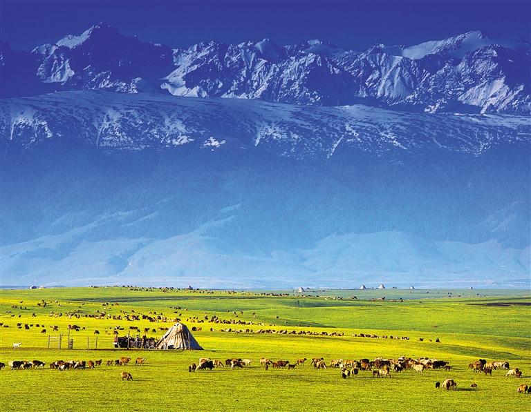 ①新疆昭苏县巴勒克苏牧场。随着生态保护力度加大,当地牧场水草丰美,景色迷人。李文武摄(中经视觉)