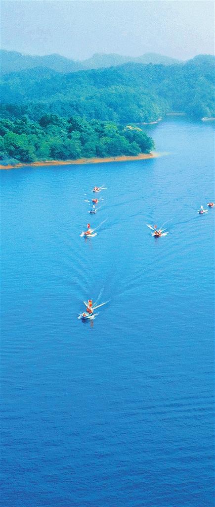 ②江西省宜春市澄塘渊明湖,冲锋舟穿行在绿水青山间。当地严格落实河湖长制、加强沿河环湖水生态修复等措施,筑牢生态屏障。张 骏摄(中经视觉)