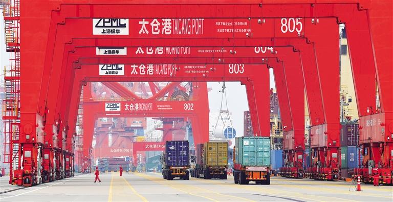 6月12日,江苏省太仓港集装箱码头一派繁忙景象。
