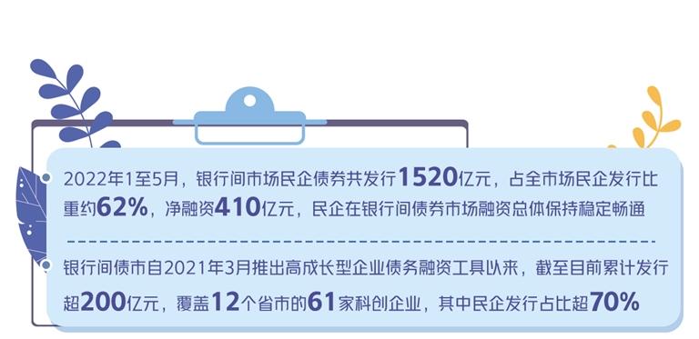 随着近期一系列支持举措落地实施,银行间市场民企债券融资回暖。经济日报记者了解到,2022年1至5月,银行间市场民企债券共发行1520亿元,占全市场民企发行比重约62%,净融资410亿元,民企在银行间债券市场融资总体保持稳定畅通,对稳定民企债券融资发挥了重要的支撑作用。