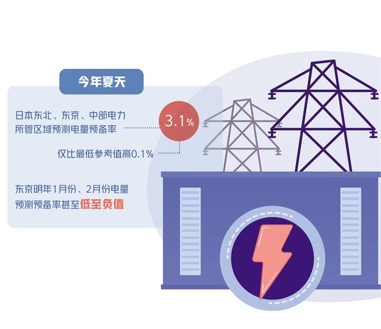 日本电力供应短缺,早有征兆。日本经济产业省4月份发布的2022年夏冬季电量预备率预测值显示,今年夏天,日本东北、东京、中部电力所管区域的预测电量预备率为3.1%,仅比最低参考值高出0.1%。而冬季的情况更为恶劣,东京明年1月份、2月份电量预测预备率甚至低至负值。