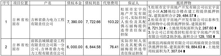 中国华融资产管理股份有限公司吉林省分公司拥有对吉林省鼎力电力工程有限责任公司、前郭县城镇建设工程有限责任公司第一分公司等2项债权,债务人所在地吉林省松原市。截至2022年6月10日,债权资产合计28,136.87万元,具体情况见下表: 单位:万元