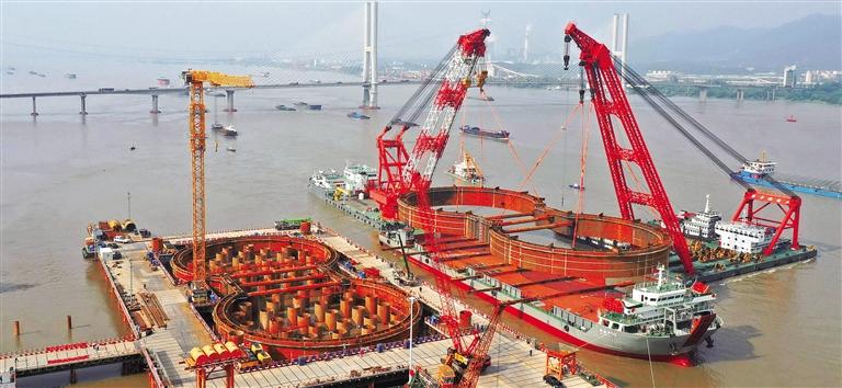 6月14日,中铁大桥局两台浮吊在G3(京台高速)铜陵长江公铁大桥3号主塔墩安装巨型钢围堰。连日来,建设者与长江汛期上涨水位“赛跑”,加快这项世界最大的哑铃型钢围堰安装。G3铜陵长江公铁大桥计划于2025年12月建成。