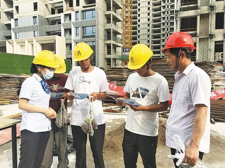 建设银行浙江东阳横店支行向工地上的外来务工人员宣传建行反假、反诈、反洗钱等金融知识。